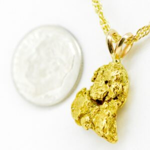 This 3.1 DWT Alaskan gold nugget pendant weighs 3.1 DWT and features a classic 14k split bail. The pendant comes with a gold plated chain in a nice box. It shows up ready to give to someone special, even if that special someone is you.