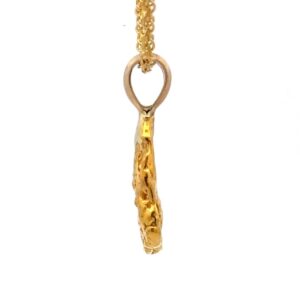 This nugget pendant features a custom made 14k gold bale that is custom fit to the nugget. The total weight is 3.2 grams and is 21mm tall including the bale and is 13mm wide. This gold nugget is a one of a kind pendant. It will definitely be conversation starter and comes with 14k gold-filled chain.