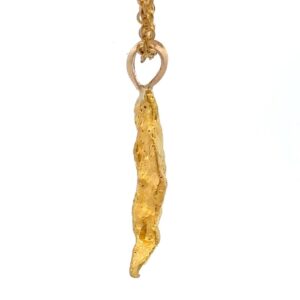 This nugget pendant features a custom made 14k gold bale that is custom fit to the nugget. The total weight is 3.7 grams and is 30mm tall including the bale and is 7mm wide. This gold nugget is a one of a kind pendant. It will definitely be conversation starter and comes with 14k gold-filled chain.