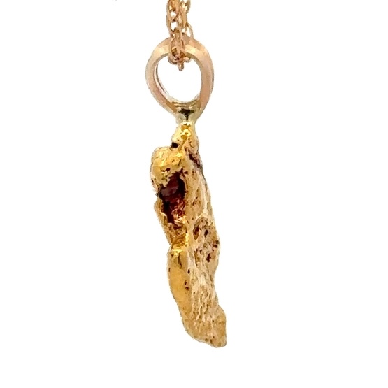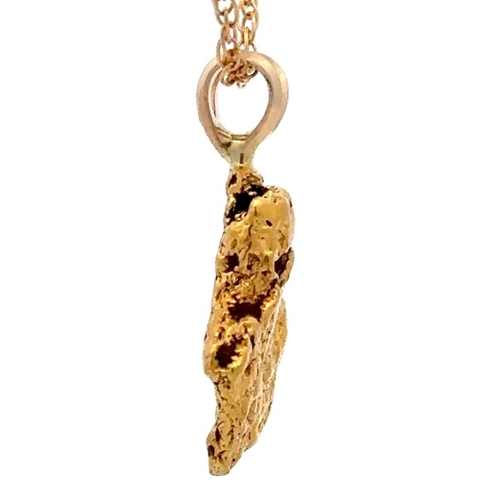 This nugget pendant features a custom made 14k gold bale that is custom fit to the nugget. The total weight is 4.9 grams and is 25mm tall including the bale and is 15mm wide. This gold nugget is a one of a kind pendant. It will definitely be conversation starter and comes with 14k gold-filled chain.