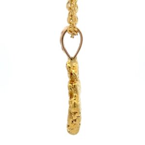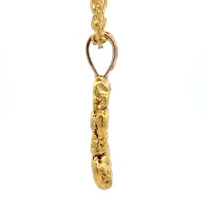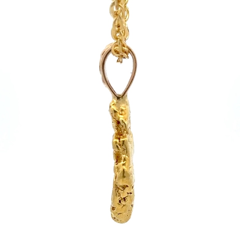 This nugget pendant features a custom made 14k gold bale that is custom fit to the nugget. The total weight is 5.1 grams and is 30mm tall including the bale and is 9mm wide. This gold nugget is a one of a kind pendant. It will definitely be conversation starter and comes with 14k gold-filled chain.