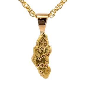 On any given day, local gold miners will come in to our shop throughout the year with the gold nuggets they mined that season. We look through their stash and choose the very best nuggets to make into pendants. These are natural pieces of placer gold? which means they are mined from the rivers and streams around Alaska. Otherwise known as the Klondike. Finding gold nuggets in their natural state is very rare. In fact, gold nuggets make up only 2% of all gold that is found. These nuggets themselves will vary in purity from about 75% to 95% pure gold, or 18k-22k. Due to the fact that these pieces are completely natural, other minerals can sometimes be?mixed in such as silver and platinum.