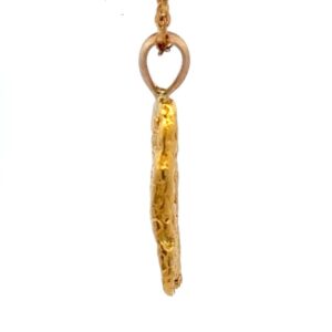 This nugget pendant features a custom made 14k gold bale that is custom fit to the nugget. The total weight is 5.2 grams and is 27mm tall including the bale and is 12mm wide. This gold nugget is a one of a kind pendant. It will definitely be conversation starter and comes with 14k gold-filled chain.
