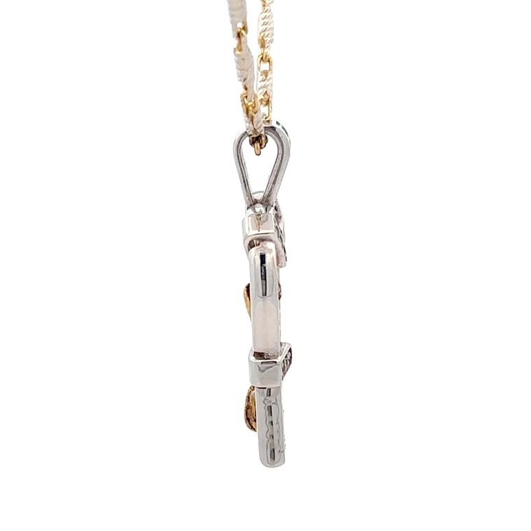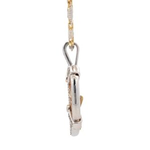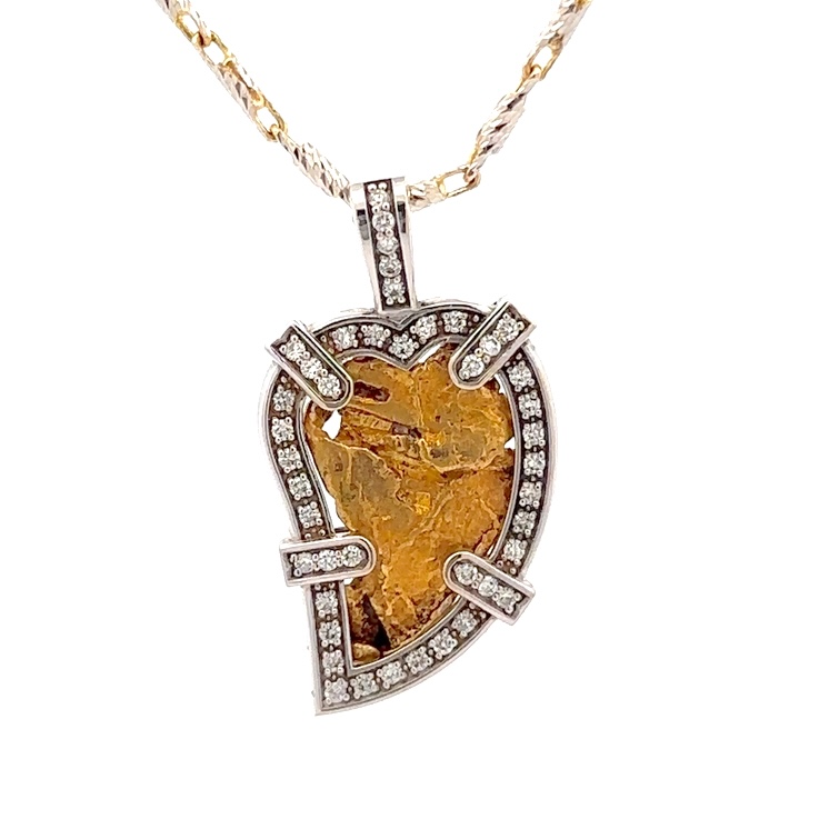 This rugged heart gold nugget pendant is made with a heavy 18k custom cage frame, and features a total diamond carat weight of .57. It is perfect for a man or woman to wear. The pendant is about 20mm wide, just over 36mm tall including the bail, and just under 4mm at its thickest. The nugget weighs 5.7 grams and the total weight of the pendant is 14.5 grams. This pendant comes with a display chain at no charge. It is pictured with a 2-tone 14K chain. We have several to choose from, give us a call at 1-907-278-8414 for some chain ideas.