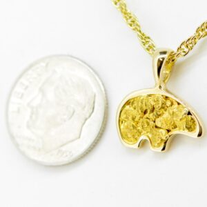 This gold nugget bear pendant has Alaskan gold nuggets and 14k mounting. A gold plated chain included.