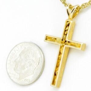 This gold nugget cross pendant is approximately 32 x 17 mm. The gold nuggets are soldiered onto a 14k mounting and a gold plated chain is included.