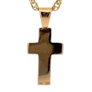 This gold nugget cross pendant is approximately 28 x 12 mm. The gold nuggets are soldered onto a 9.9-gram 14k mounting, and a gold-plated chain is included.