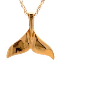 This polished gold quartz & gold nugget whale tail pendant is expertly crafted in 14k gold. It is about 23mm wide and 25mm tall. The necklace comes with a 14k gold-plated chain. The smooth, polished surface brilliantly reflects light, capturing attention from every angle. The photos showcase enlarged details of this exquisite piece.
