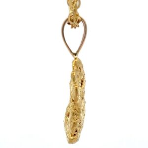 This nugget pendant features a custom made 14k gold bale that is custom fit to the nugget. The total weight is 7.4 grams and is 28.9mm tall including the bale, and is 14.4 mm wide. This gold nugget is a one of a kind pendant. It will definitely be conversation starter and comes with 14k gold-filled chain.
