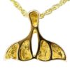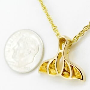 This Alaskan 4 panel gold nugget whale tail pendant is set in 14k gold. The whale tail has gold nugget overlay on both tails. The pendant comes with a gold plated chain in a nice box. It shows up ready to give to someone special, even if that special someone is you.