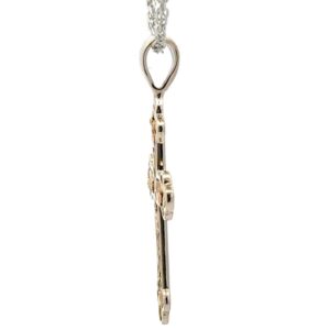 This gold nugget cross pendant is approximately 39 x 19 mm & weighs 7 grams. The gold nuggets are soldered onto a 14k white gold mounting, and a gold-plated chain is included.