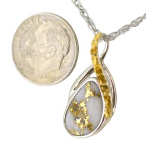 Comes with a base metal chain. Photos are enlarged to display detail. “Gold Bearing Quartz” is a natural gemstone that is usually mined deep underground. Finding snowy white quartz with visible veins of pure gold is extremely difficult. Most of the time, gold mined in quartz is found in microscopic amounts, not at all visible. This very rare stone is then cut into slabs, revealing the gold vein, then cut, shaped, polished and mounted into a 14k white gold mounting. Because of the veining of the gold, each piece of jewelry is one of a kind! We make this stone into wonderful pieces for both men and women, rings, bracelets, earrings, cuff links, and anything else you might imagine. We can even design a custom piece for you.