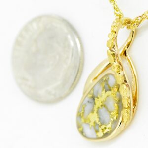 The pendant features a natural gemstone known as “Gold Bearing Quartz,” typically mined from deep underground. In most cases, gold found in quartz exists in microscopic amounts, making it virtually invisible. However, this pendant boasts an extraordinary rarity as it showcases a very scarce stone that is first cut into slabs, revealing the precious gold vein. Subsequently, skilled artisans cut, shape, polish, and mount it into a 14k gold setting. Embrace the allure of this remarkable Gold Bearing Quartz pendant and celebrate the natural beauty of this exceptional gemstone.