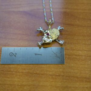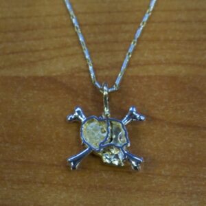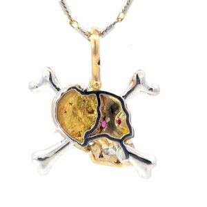 This rugged “Golden Skull” nugget pendant is made with a heavy 18k white and yellow gold custom cage frame, along with genuine ruby eyes. We wanted to make something that looks like it was made for the crusty gold miner that found a special nugget like this back in the day! It is perfect for a man or woman to wear. The pendant is 1 1/8″ wide, and over 1 1/4″ tall including the bail. The nugget weighs 3.3 grams and the total weight of the pendant is 14.8 grams. This pendant is shown on our 2-tone gold chain, but comes with a gold filled display chain at no charge. We have several nice gold chains to choose from, give us a call at 1-907-278-8414 for some special ideas.