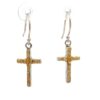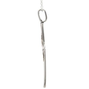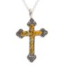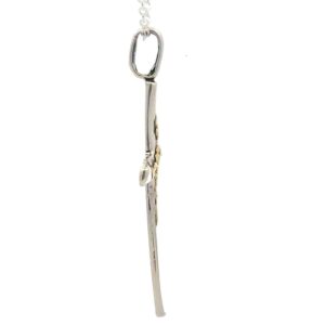 This Cross pendant, gold nugget & silver features natural gold nuggets soldered into a cross-shaped setting. The pendant is about 19mm wide and 36mm tall (including bail). This piece weighs 3.1 grams. Mounting it in silver helps show off the rich color of the gold against the silver background, and it also keeps the price lower. These gold nuggets make very interesting, one-of-a-kind jewelry. They will definitely be conversation starters. Because the nuggets are natural, the nugget shapes will vary; the photo shown is a sample piece. It comes with a silver-plated chain and is mounted in a gift box. Photos are enlarged to display detail.