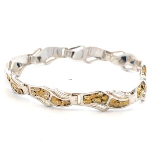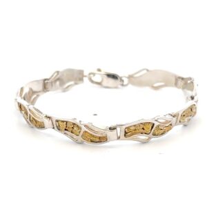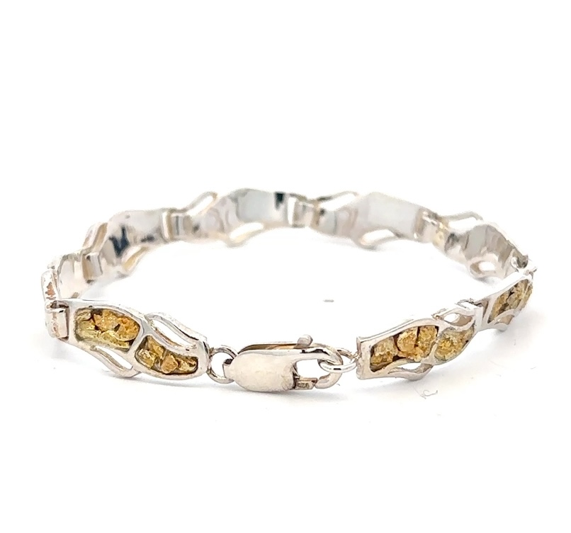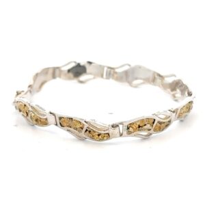 This gold nugget bracelet is expertly crafted in sterling silver. This bracelet is 7.75″ long. Each nugget is precisely set into the sterling silver setting with solder.