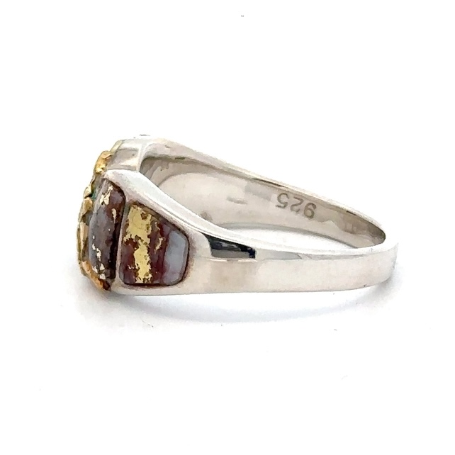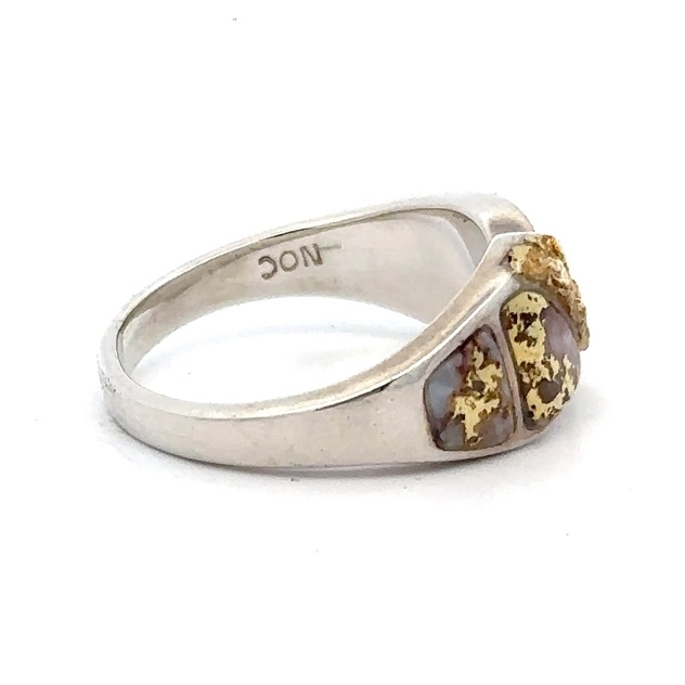 This gold quartz gold nugget ring is set in sterling silver. The ring measures 8mm at its widest point and 3mm at its thinnest. The ring weighs 6 grams.