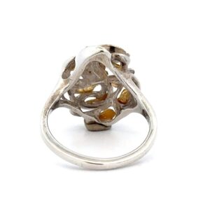 This gold nugget ring is set in sterling silver. The ring measures 28mm at its widest point and 2mm at its thinnest. The ring weighs 4.7 grams.