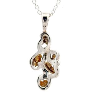 This pendant, gold nugget & silver features natural gold nuggets soldered into a setting. The pendant is about 7mm wide and 22mm tall (including bail). This piece weighs 3.3 grams. Mounting it in silver helps show off the rich color of the gold against the silver background, and it also keeps the price lower. These gold nuggets make very interesting, one-of-a-kind jewelry. They will definitely be conversation starters. Because the nuggets are natural, the nugget shapes will vary; the photo shown is a sample piece. It comes with a silver-plated chain and is mounted in a gift box. Photos are enlarged to display detail.