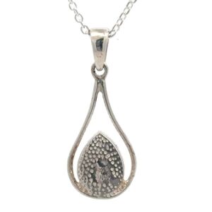 This teardrop pendant, gold nugget & silver features natural gold nuggets soldered into a setting. The pendant is about 7mm wide and 21mm tall (including bail). This piece weighs 1.2 grams. Mounting it in silver helps show off the rich color of the gold against the silver background, and it also keeps the price lower. These gold nuggets make very interesting, one-of-a-kind jewelry. They will definitely be conversation starters. Because the nuggets are natural, the nugget shapes will vary; the photo shown is a sample piece. It comes with a silver-plated chain and is mounted in a gift box. Photos are enlarged to display detail.