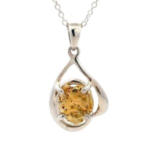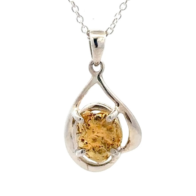 This pendant, gold nugget & silver features natural gold nuggets soldered into a setting. The pendant is about 10mm wide and 21mm tall (including bail). This piece weighs 3.6 grams. Mounting it in silver helps show off the rich color of the gold against the silver background, and it also keeps the price lower. These gold nuggets make very interesting, one-of-a-kind jewelry. They will definitely be conversation starters. Because the nuggets are natural, the nugget shapes will vary; the photo shown is a sample piece. It comes with a silver-plated chain and is mounted in a gift box. Photos are enlarged to display detail.