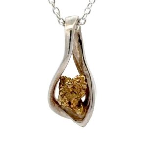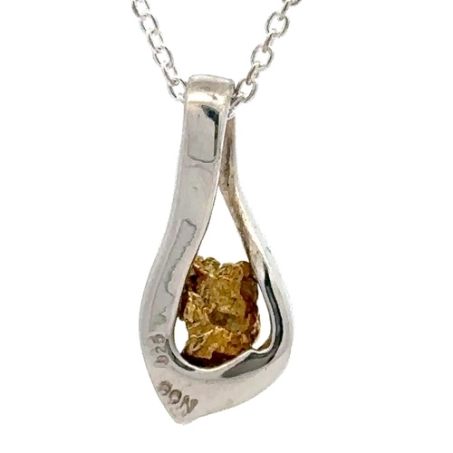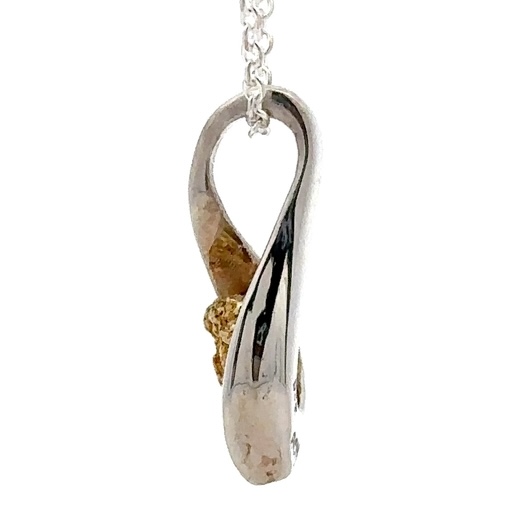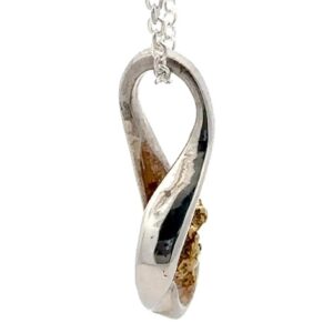 This pendant, gold nugget & silver features natural gold nuggets soldered into a figure eight-shaped setting. The pendant is about 6mm wide and 15mm tall (including bail). This Piece weighs 3.4 grams. Mounting it in silver helps show off the rich color of the gold against the silver background, and it also keeps the price lower. These gold nuggets make very interesting, one-of-a-kind jewelry. They will definitely be conversation starters. Because the nuggets are natural, the nugget shapes will vary; the photo shown is a sample piece. It comes with a silver-plated chain and is mounted in a gift box. Photos are enlarged to display detail.