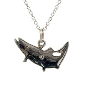 This salmon pendant, gold nugget & silver features natural gold nuggets soldered into a salmon-shaped setting. The pendant is about 15mm wide and 6mm tall (including bail). This Piece weighs 2.9 grams. Mounting it in silver helps show off the rich color of the gold against the silver background, and it also keeps the price lower. These gold nuggets make very interesting, one-of-a-kind jewelry. They will definitely be conversation starters. Because the nuggets are natural, the nugget shapes will vary; the photo shown is a sample piece. It comes with a silver-plated chain and is mounted in a gift box. Photos are enlarged to display detail.