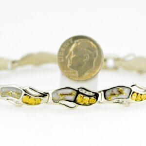 “Gold Bearing Quartz” is a natural gemstone that is usually mined deep underground. Finding snowy white quartz with visible veins of pure gold is extremely difficult. Most of the time, gold mined in quartz is found in microscopic amounts, not at all visible. This very rare stone is cut into slabs, revealing the gold vein. They are then cut, shaped, polished and mounted into a 14k white gold mounting. Because of the veining of the gold, each piece of jewelry is one of a kind! We make this rare stone into wonderful pieces for both men and women in rings, bracelets, earrings, cuff links, and anything else you might imagine.