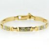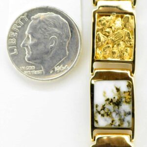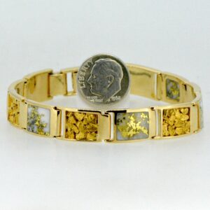 Check out this unique gold quartz & nugget bracelet. Very simple and elegant, inlaid into 14k yellow gold. It is very sturdy. It measures about 8″ long and approximately (10.9 mm) almost 1/2″ wide. This style of bracelet is very durable and made for everyday wear. All of our quartz pieces have a 5 year guarantee against breakage of the stones under normal use. They are about an 8 on the hardness scale. This would make a beautiful addition to your collection.