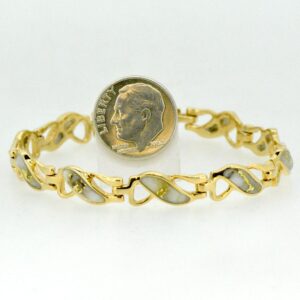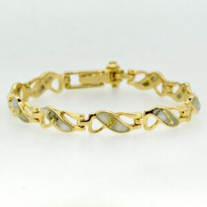 This bracelets, with gold bearing quartz inlaid into 14k yellow gold links. Very simple, elegant and sturdy. It measures about 7″ long and just over 1/4″ wide. This style of bracelet is very durable and made for everyday wear. All of our quartz pieces have a 5 year guarantee against breakage of the stones under normal use. They are about an 8 on the hardness scale. This would make a beautiful addition to your collection.