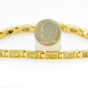 This is one of our classic bracelets, with gold bearing quartz inlaid into 14k yellow gold links. Very simple, elegant and sturdy. This style of bracelet is very durable and made for everyday wear. All of our quartz pieces have a 5 year guarantee against breakage of the stones under normal use. They are about an 8 on the hardness scale. This would make a beautiful addition to your collection.