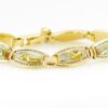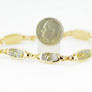 Check out this unique gold quartz bracelet. It features 7 pieces of natural gold bearing quartz mounted in 14k yellow gold. It is 7 inches long and has a safety clasp. All of our quartz pieces have a 5 year guarantee against breakage of the stones under normal use. They are about an 8 on the hardness scale. This would make a beautiful addition to your collection.