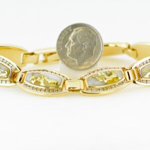 Check out this unique gold quartz & diamond bracelet. It features natural gold bearing quartz and 2.10 carats of natural diamonds mounted in 14k yellow gold. It is 7 inches long and has a safety clasp. All of our quartz pieces have a 5 year guarantee against breakage of the stones under normal use. They are about an 8 on the hardness scale. This would make a beautiful addition to your collection.