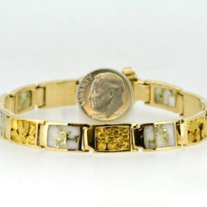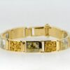 This is one of our classic bracelets, with alternating gold bearing quartz and natural nugget links. Very simple and elegant, inlaid into 14k yellow gold. It is very sturdy. It measures about 8″ long and about nine mm wide. This style of bracelet is very durable and made for everyday wear. All of our quartz pieces have a 5 year guarantee against breakage of the stones under normal use. They are about an 8 on the hardness scale. This would make a beautiful addition to your collection.