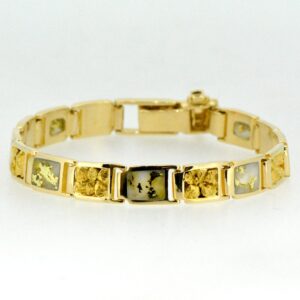 This is one of our classic bracelets, with alternating gold bearing quartz and natural nugget links. Very simple and elegant, inlaid into 14k yellow gold. It is very sturdy. It measures about 7.25″ long and over 1/4″ wide. This style of bracelet is very durable and made for everyday wear. All of our quartz pieces have a 5 year guarantee against breakage of the stones under normal use. They are about an 8 on the hardness scale. This would make a beautiful addition to your collection.