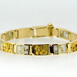 This is one of our classic bracelets, with alternating gold bearing quartz and natural nugget links. Very simple and elegant, inlaid into 14k yellow gold. It is very sturdy. It measures about 8″ long and about nine mm wide. This style of bracelet is very durable and made for everyday wear. All of our quartz pieces have a 5 year guarantee against breakage of the stones under normal use. They are about an 8 on the hardness scale. This would make a beautiful addition to your collection.