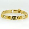 This is one of our classic bracelets, with gold bearing quartz inlaid into 14k yellow gold links. Very simple, elegant and sturdy. It measures about 7.25″ long and (10mm) almost 1/2″ wide. This style of bracelet is very durable and made for everyday wear. All of our quartz pieces have a 5 year guarantee against breakage of the stones under normal use. They are about an 8 on the hardness scale. This would make a beautiful addition to your collection.