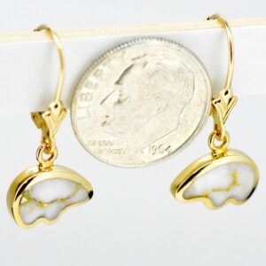 The earrings feature a natural gemstone known as “Gold Bearing Quartz,” typically mined from deep underground. In most cases, gold found in quartz exists in microscopic amounts, making it virtually invisible. However, these earrings boast an extraordinary rarity as it showcases a very scarce stone that is first cut into slabs, revealing the precious gold vein. Skilled artisans cut, shape, polish, and mount the gold quartz into a 14k gold setting. Embrace the allure of these remarkable Gold Bearing Quartz earrings and celebrate the natural beauty of this exceptional gemstone.