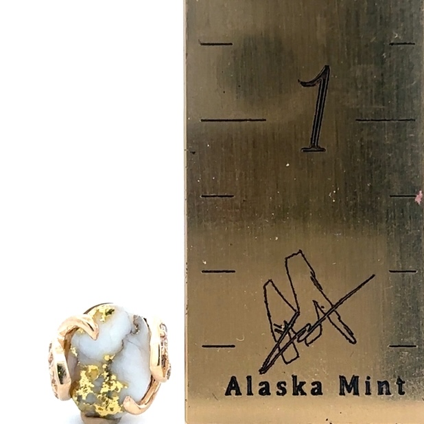 Gold-bearing quartz is a natural gemstone that is usually mined deep underground. Finding snowy white quartz with visible veins of pure gold is extremely difficult. Most of the time, gold mined in quartz is found in microscopic amounts, not at all visible. This very rare stone is cut into slabs, revealing the gold vein, then cut, shaped, polished, and mounted into a 14k gold mounting. Because of the veining of the gold, each piece of jewelry is one of a kind! We make this stone into wonderful pieces for both men and women in rings, bracelets, earrings, cuff links, and anything else you might imagine. We can even design a custom piece for you.