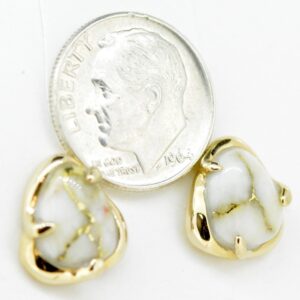 The earrings feature a natural gemstone known as “Gold Bearing Quartz,” typically mined from deep underground. In most cases, gold found in quartz exists in microscopic amounts, making it virtually invisible. However, these earrings boast an extraordinary rarity as it showcases a very scarce stone that is first cut into slabs, revealing the precious gold vein. Skilled artisans cut, shape, polish, and mount the gold quartz into a 14k gold setting. Embrace the allure of these remarkable Gold Bearing Quartz earrings and celebrate the natural beauty of this exceptional gemstone.