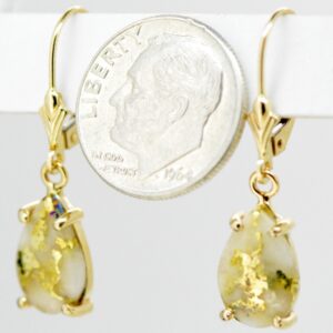 The earrings feature a natural gemstone known as “Gold Bearing Quartz,” typically mined from deep underground. In most cases, gold found in quartz exists in microscopic amounts, making it virtually invisible. However, these earrings boast an extraordinary rarity as it showcases a very scarce stone that is first cut into slabs, revealing the precious gold vein. Skilled artisans cut, shape, polish, and mount the gold quartz into a 14k gold setting. Embrace the allure of these remarkable Gold Bearing Quartz earrings and celebrate the natural beauty of this exceptional gemstone.