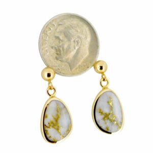 The earrings feature a natural gemstone known as “Gold Bearing Quartz,” typically mined from deep underground. In most cases, gold found in quartz exists in microscopic amounts, making it virtually invisible. However, these earrings boast an extraordinary rarity as it showcases a very scarce stone that is first cut into slabs, revealing the precious gold vein. Skilled artisans cut, shape, polish, and mount the gold quartz into a 14k gold setting. Embrace the allure of these remarkable Gold Bearing Quartz earrings and celebrate the natural beauty of this exceptional gemstone.
