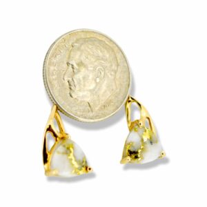 Photos are enlarged to display detail. “Gold Bearing Quartz” is a natural gemstone that is usually mined deep underground. Finding snowy white quartz with visible veins of pure gold is extremely difficult. Most of the time, gold mined in quartz is found in microscopic amounts, not at all visible. This very rare stone is then cut into slabs, revealing the gold vein, then cut, shaped, polished and mounted into a 14k gold mounting. Because of the veining of the gold, each piece of jewelry is one of a kind! We make this stone into wonderful pieces for both men and women, rings, bracelets, earrings, cuff links, and anything else you might imagine. We can even design a custom piece for you.