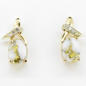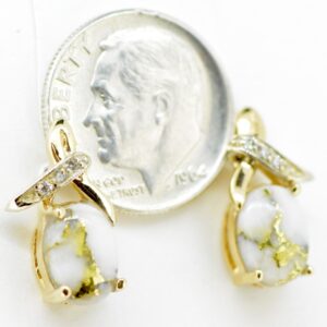 Photos are enlarged to display detail. “Gold Bearing Quartz” is a natural gemstone that is usually mined deep underground. Finding snowy white quartz with visible veins of pure gold is extremely difficult. Most of the time, gold mined in quartz is found in microscopic amounts, not at all visible. This very rare stone is then cut into slabs, revealing the gold vein, then cut, shaped, polished and mounted into a 14k gold mounting. Because of the veining of the gold, each piece of jewelry is one of a kind! We make this stone into wonderful pieces for both men and women, rings, bracelets, earrings, cuff links, and anything else you might imagine. We can even design a custom piece for you.