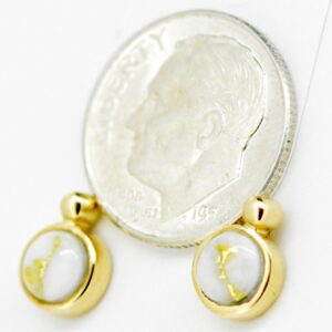 The earrings feature a natural gemstone known as “Gold Bearing Quartz,” typically mined from deep underground. In most cases, gold found in quartz exists in microscopic amounts, making it virtually invisible. However, these earrings boast an extraordinary rarity as it showcases a very scarce stone that is first cut into slabs, revealing the precious gold vein. Skilled artisans cut, shape, polish, and mount the gold quartz into a 14k gold setting. Embrace the allure of these remarkable Gold Bearing Quartz earrings and celebrate the natural beauty of this exceptional gemstone.