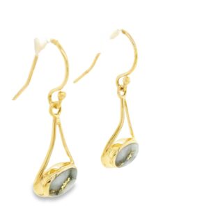 The earrings feature a natural gemstone known as “Gold Bearing Quartz,” typically mined from deep underground. In most cases, gold found in quartz exists in microscopic amounts, making it virtually invisible. However, these earrings boast an extraordinary rarity as it showcases a very scarce stone that is first cut into slabs, revealing the precious gold vein. Skilled artisans cut, shape, polish, and mount the gold quartz into a 14k gold setting. Embrace the allure of these remarkable Gold Bearing Quartz earrings and celebrate the natural beauty of this exceptional gemstone.