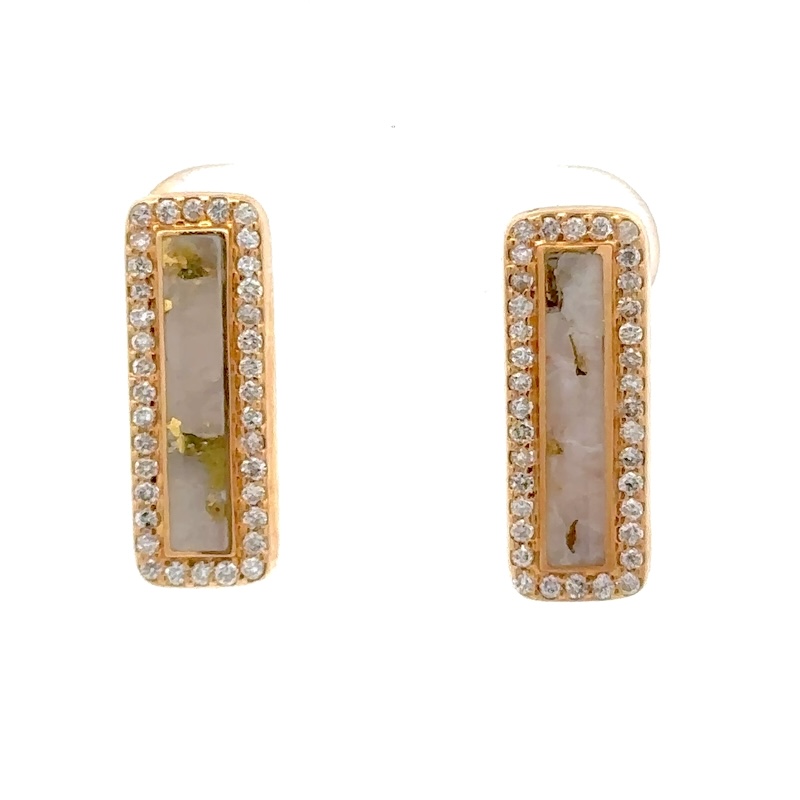 The earrings feature a natural gemstone known as “Gold Bearing Quartz,” typically mined from deep underground. In most cases, gold found in quartz exists in microscopic amounts, making it virtually invisible. However, these earrings boast an extraordinary rarity as it showcases a very scarce stone that is first cut into slabs, revealing the precious gold vein. Skilled artisans cut, shape, polish, and mount the gold quartz into a 14k gold setting. Embrace the allure of these remarkable Gold Bearing Quartz earrings and celebrate the natural beauty of this exceptional gemstone.