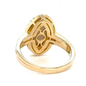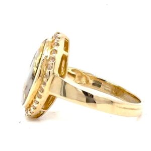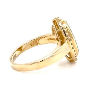 This lady’s gold quartz ring is expertly crafted in 14k yellow gold. It features a halo of diamonds around the stone. The smooth, polished surface brilliantly reflects light, capturing attention from every angle. The photos showcase enlarged details of this piece.