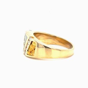 The ring features a natural gemstone known as “Gold Bearing Quartz,” typically mined from deep underground. In most cases, gold found in quartz exists in microscopic amounts, making it virtually invisible. However, this ring boasts an extraordinary rarity as it showcases a very scarce stone that is first cut into slabs, revealing the precious gold vein. Subsequently, it is skillfully cut, shaped, polished, and mounted into a 14k gold setting. Embrace the allure of this remarkable Gold Bearing Quartz ring and celebrate the natural beauty of this exceptional gemstone.