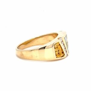 This gold quartz center stone & gold nugget inlaid band is expertly crafted in 14k gold. This piece also has two inlaid rows of diamonds separating the gold quartz from the gold nuggets. The photos showcase enlarged details of this exquisite piece.